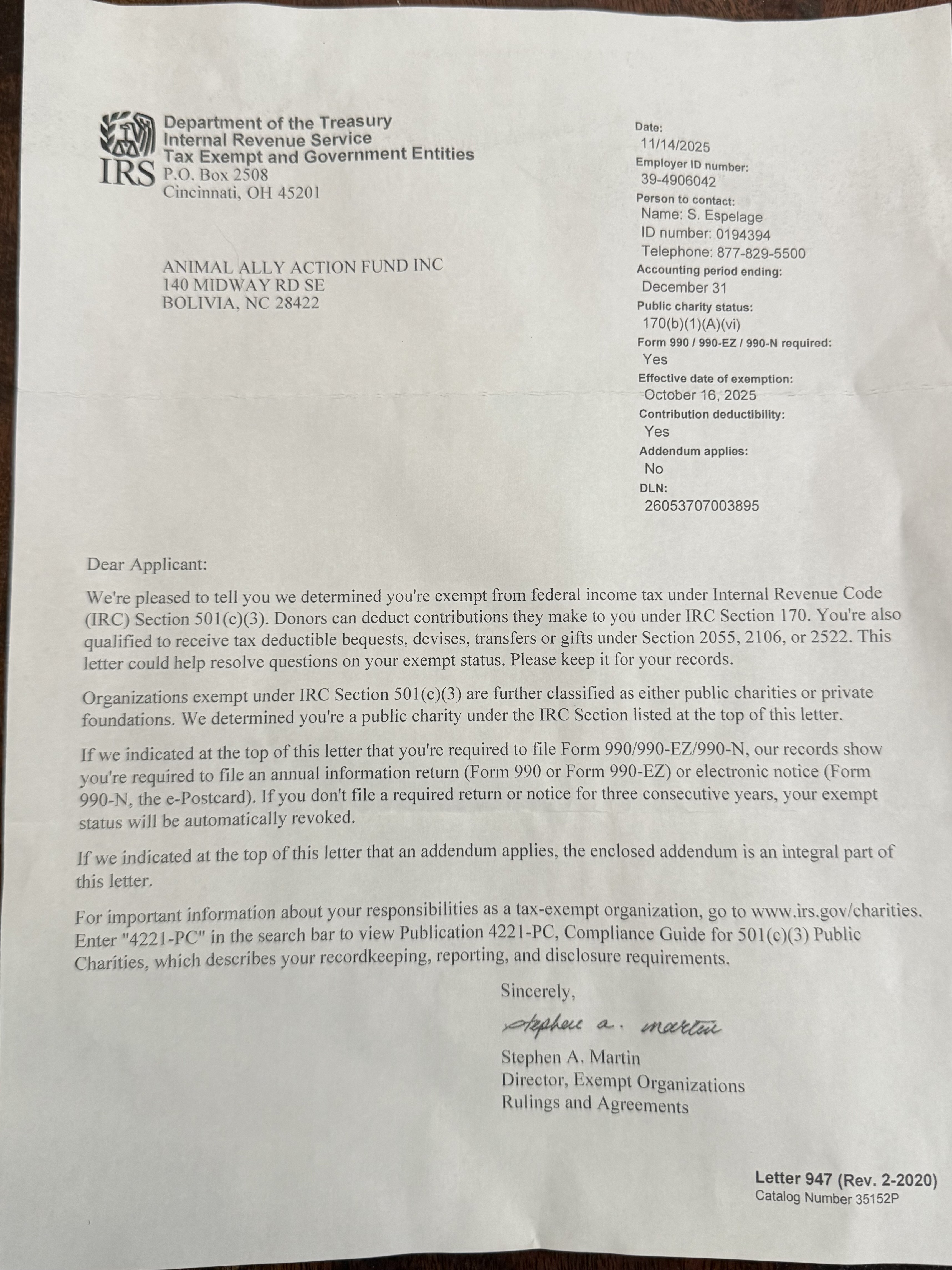 In October of 2025, we officially obtained our determination letter and became a registered 501c3 charitable organization. Click here to view it.